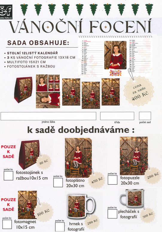 V pondělí 10.11. proběhne v naší škole vánoční focení. Děti dostanou objednávkový leták. Pokud máte zájem, odevzdejte objednávku do pátku 7.11.